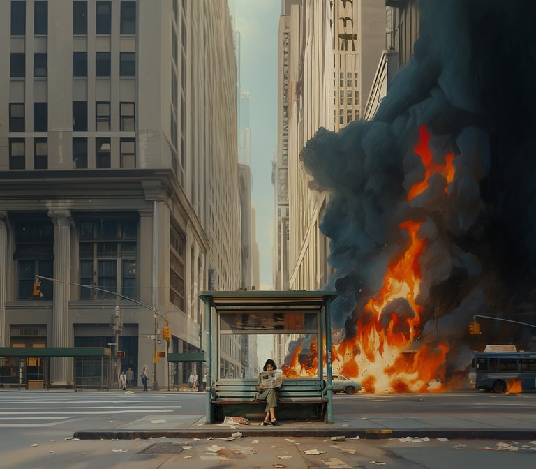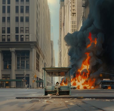 Through a delicate interplay of stillness and chaos, each piece captures the quiet tension between interior serenity and external collapse. A figure might sit alone, unmoved, while fire consumes the world beyond, a visual metaphor for our collective disconnection in the face of climate crisis.